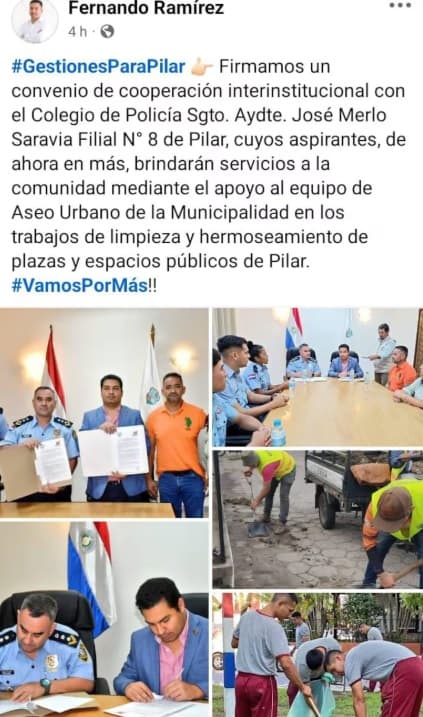 La polémica surgió luego de que el intendente de Pilar, Fernando Luis Ramírez González (ANR), publicara en redes sociales un anuncio sobre la firma de un convenio de cooperación interinstitucional. En el acuerdo, los futuros agentes debían colaborar con tareas de limpieza y hermoseamiento de espacios públicos, en apoyo al equipo de Aseo Urbano de la Municipalidad.