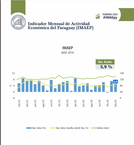 La actividad económica paraguaya inició 2025 con notable dinamismo según refleja el Indicador Mensual de la Actividad Económica (Imaep), que registró una expansión del 4,9% en febrero, acumulando un crecimiento del 5,9% en los dos primeros meses del año.