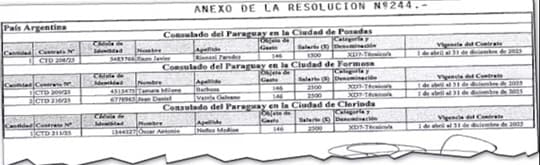 El Ministerio de Relaciones Exteriores confirmó la contratación de cuatro nuevos funcionarios técnicos para los consulados paraguayos en Argentina. La Resolución N° 244, firmada por el canciller Rubén Ramírez Lezcano el 4 de abril, autoriza estas designaciones con salarios entre 1.300 y 2.500 dólares mensuales para los consulados en Posadas, Formosa y Clorinda. Según fuentes diplomáticas, los nombramientos responden a recomendaciones políticas del actual presidente del Congreso, Basilio "Bachi" Núñez, del movimiento Honor Colorado.