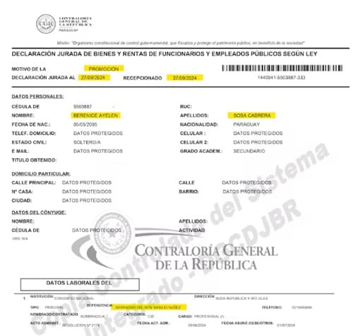 Apenas seis meses después del primer incremento, en enero de 2025, la sobrina del presidente del Congreso recibió un segundo aumento. Fue reasignada a la Dirección de Mantenimiento del Congreso con la categoría de “técnico (III)” y un salario mensual de G. 9.500.000, lo que representa un incremento del 111% respecto a su remuneración inicial en menos de dos años de servicio.
