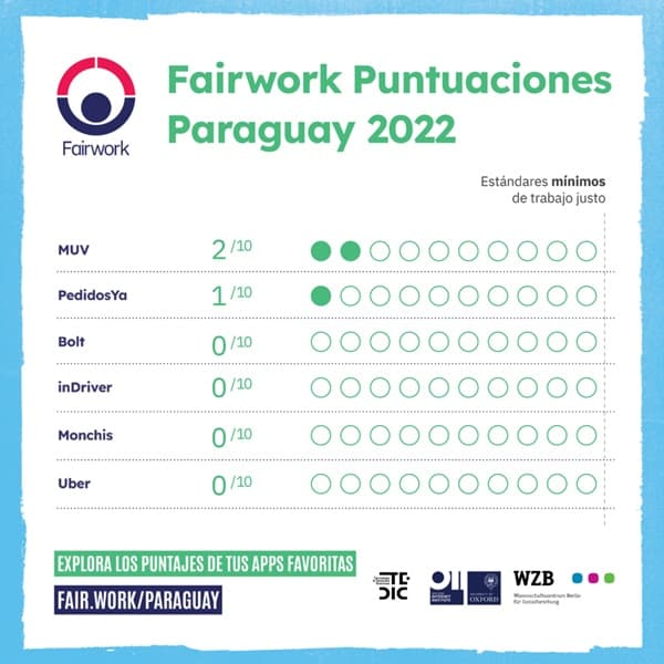 El proyecto Fairwork, activo en más de 40 países, evalúa las condiciones laborales en plataformas como Uber, Muv, Bolt y Pedidos Ya, entre otras. En Paraguay, la organización TEDIC se integró a esta red global en 2021 y publicó el primer reporte nacional en 2022, revelando importantes desafíos para los trabajadores de aplicaciones de transporte y delivery. Los resultados fueron preocupantes: ninguna plataforma superó los dos puntos de un máximo de 10, aunque cabe destacar que la puntuación más alta correspondió a una iniciativa local, lo que demuestra el potencial para desarrollar mejores prácticas desde el propio ecosistema paraguayo.