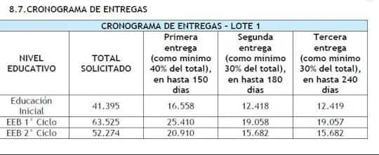 Los plazos establecidos en el PBC indican que la empresa debe entregar como mínimo el 40% del total (132.000 pupitres) en hasta 150 días desde la firma del contrato, seguido por dos entregas adicionales del 30% cada una en plazos de 180 y 240 días respectivamente. Sin embargo, José Luis Rodríguez Tornaco, superintendente de Comunicación Social de Itaipú, había anunciado que la intención era suministrar el 50% de los pupitres (150.000) en apenas 45 días, meta que parece inalcanzable considerando que solo han entregado 50.000 unidades cuando faltan apenas diez días para vencer ese plazo autoimpuesto.