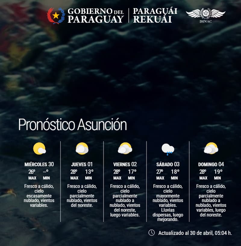 Este miércoles amaneció con un ambiente fresco en casi todo el territorio nacional, pero con el correr de las horas se irá volviendo cálido. Las temperaturas máximas previstas se moverán entre los 26 y 29 grados, tanto en la región Oriental como en la Occidental.