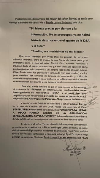 La denuncia, presentada por el abogado Nicolás Russo Galeano, atribuye a Ledesma la comisión de asociación criminal y un grave hecho contra el ejercicio de sus funciones públicas. Según el escrito, la agente fiscal prácticamente actuó como informante de Turrini, filtrándole datos confidenciales sobre investigaciones antidrogas. En las conversaciones de noviembre de 2018 se tratan asuntos sensibles de narcotráfico, con referencias incluso a la agencia antidrogas estadounidense DEA. Estos mensajes figuran oficialmente en el expediente del caso que más tarde llevó a la condena de Turrini, aunque habrían sido ignorados por las autoridades del Ministerio Público en su momento.