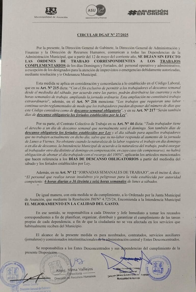La disposición afecta a funcionarios operativos y administrativos, y solo exceptúa a los que estén asignados a emergencias específicas o imprevistos, con autorización expresa. En el documento, la municipalidad argumenta que la decisión responde a lo establecido por el Código Laboral y el Contrato Colectivo de Trabajo, pero también admite que busca optimizar el gasto municipal.
