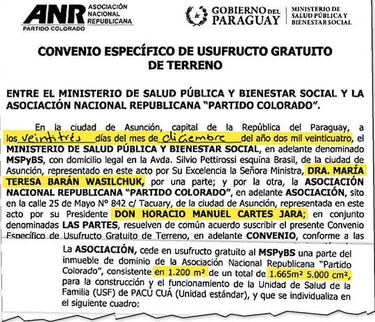 El acuerdo fue firmado en noviembre de 2024 por la ministra María Teresa Barán Wasilchuk y el expresidente Horacio Cartes Jara, en su rol de titular del Partido Colorado. Si bien el anuncio inicial se presentó como una "donación", lo que se concretó fue un convenio de usufructo por 30 años, renovable automáticamente, sin traspaso de titularidad del inmueble.