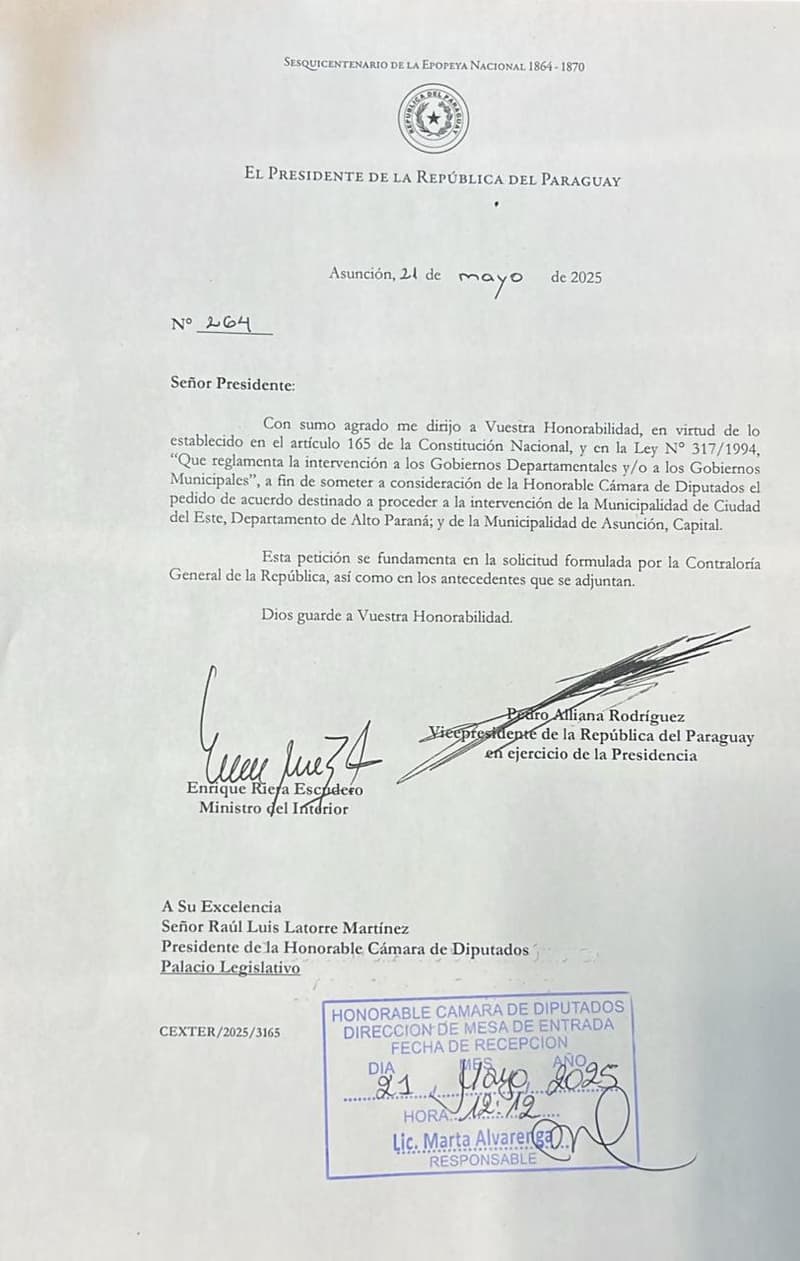 Este miércoles al mediodía ingresaron oficialmente a la Cámara de Diputados los pedidos de intervención de las municipalidades de Ciudad del Este y Asunción. Así lo confirmó el titular de la Cámara Baja, Raúl Latorre. A partir de ahora, se activan los plazos legales establecidos para analizar ambas solicitudes, que afectan a dos figuras políticas antagónicas: el opositor Miguel Prieto y el oficialista Óscar “Nenecho” Rodríguez.