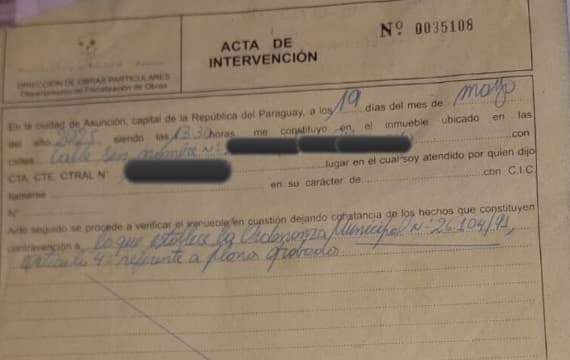 Acta de intervención dejada por la Municipalidad de Asunción frente al domicilio de Matilde Schaerer, autora del escrache al intendente de Asunción, Óscar "Nenecho" Rodríguez (ANR-HC).