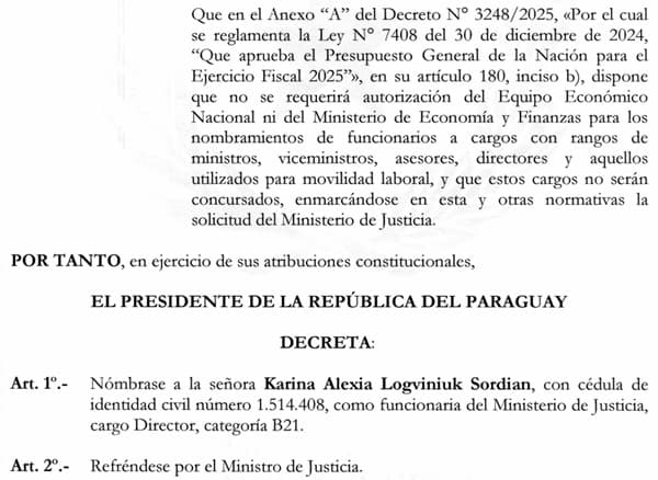 El Ministerio de Justicia vuelve a estar en el centro de cuestionamientos institucionales por la designación de Karina Logviniuk como secretaria de la jefa de Gabinete. Su nombramiento fue oficializado mediante Decreto Presidencial el 3 de abril como directora, pero sorprendentemente, cinco días después, fue reubicada como secretaria sin explicaciones públicas.