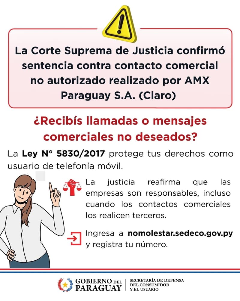 La Secretaría de Defensa del Consumidor y el Usuario (Sedeco) impulsa el uso del Registro Nacional “No Molestar”, una herramienta legal que permite a los usuarios de telefonía celular bloquear llamadas y mensajes publicitarios no deseados en todo el territorio paraguayo.