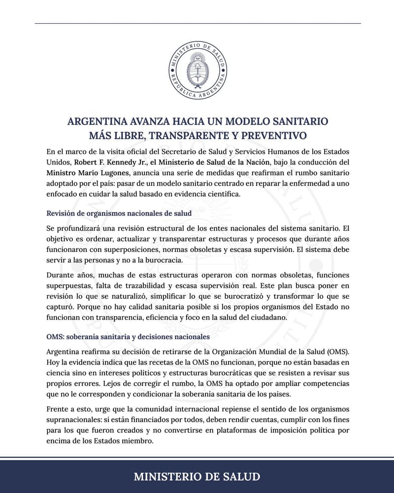 Además de la salida del organismo global, el gobierno argentino anunció una “revisión estructural profunda” del sistema de salud nacional. Esto incluye la modernización de normas, la reducción de superposiciones administrativas y un mayor control sobre los procesos sanitarios internos.