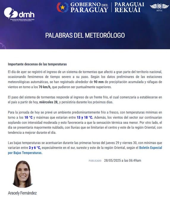 El jueves 29 y viernes 30 se esperan las temperaturas más bajas de la semana, con mínimas entre 3 y 6 °C, especialmente en los departamentos del sur, sureste y este como Itapúa, Caazapá y Alto Paraná. La Dirección de Meteorología emitió un Boletín Especial por Bajas Temperaturas, advirtiendo a la población sobre el riesgo de frío intenso, especialmente en horas de la madrugada.