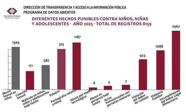 Además del abuso sexual, el Ministerio Público registró 8.159 hechos punibles que afectaron a niños, niñas y adolescentes en diferentes modalidades. Entre ellos se contabilizan 587 víctimas de maltrato bajo tutela, 315 casos de estupro, 1.187 relacionados con pornografía infantil, y otros casos como abuso por medios tecnológicos, actos homosexuales con menores y abuso en personas bajo tutela.