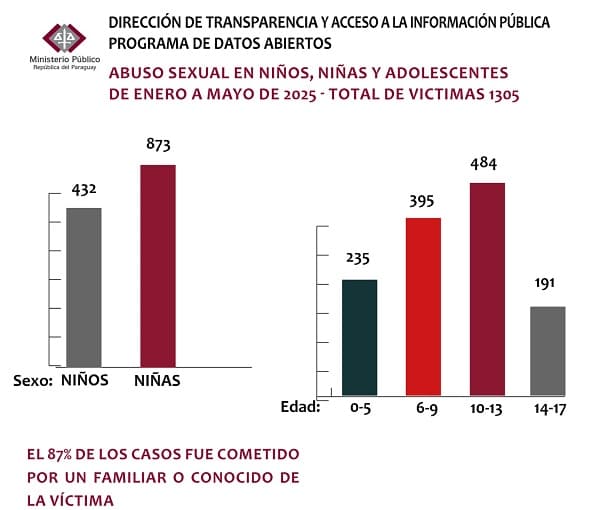 Los departamentos con mayor cantidad de denuncias por abuso sexual infantil son Central con 465 casos, seguido de Alto Paraná con 176, Asunción con 110 e Itapúa con 102. También se reportaron cifras relevantes en Caaguazú (77), San Pedro (54), Cordillera (40), Presidente Hayes (35) y Amambay (42). El 86% de las víctimas tienen menos de 14 años.
