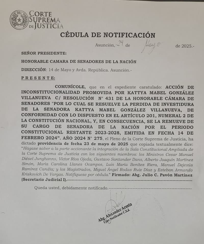 La Corte Suprema de Justicia dio un paso clave este jueves en el proceso judicial que busca revertir la expulsión de la exsenadora Kattya González. El Senado fue notificado oficialmente sobre la integración de la Sala Constitucional, que ahora cuenta con sus nueve miembros para estudiar la acción de inconstitucionalidad presentada por la exlegisladora.