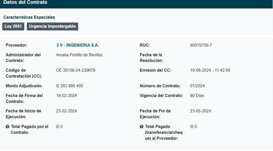 Según los registros de la Dirección Nacional de Contrataciones Públicas (DNCP), los fondos fueron adjudicados a la firma 3V Ingeniería SA, responsable de la ejecución de obras como la construcción de una cantina, reacondicionamiento de baños, nivelación de suelo, instalación de pérgolas y alumbrado solar. Sin embargo, los precios y la calidad de los trabajos despertaron críticas por parte de concejales y ciudadanos.