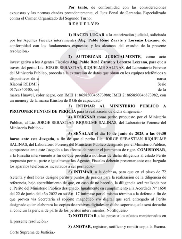 Además, el Juzgado exigió que la defensa provea un soporte digital para la entrega formal de las copias extraídas del contenido.