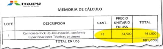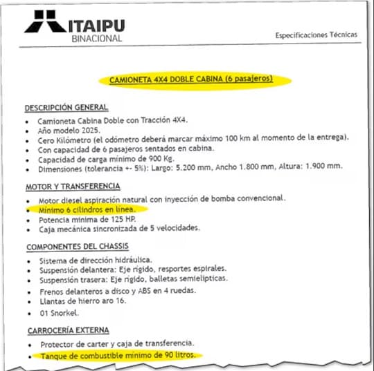 El monto exacto presupuestado por la entidad es de USD 981.000, lo que equivale a unos G. 7.749 millones. Cada camioneta tendría un costo estimado de USD 54.500. La convocatoria fue publicada bajo el número de llamado NA 0609-25 y la apertura de sobres está prevista para este viernes 13 de junio a las 8:30 en la oficina de la binacional, en Asunción.