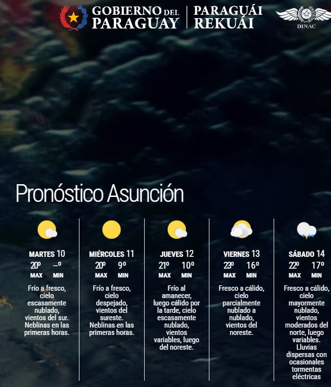 Paraguay arrancó la jornada del martes 10 de junio con un ambiente frío que se sintió con más fuerza en el sur y el centro del país. Según los reportes de la Dirección de Meteorología, el clima se mantendrá seco y estable, sin lluvias a la vista, en una semana marcada por la expectativa futbolera.