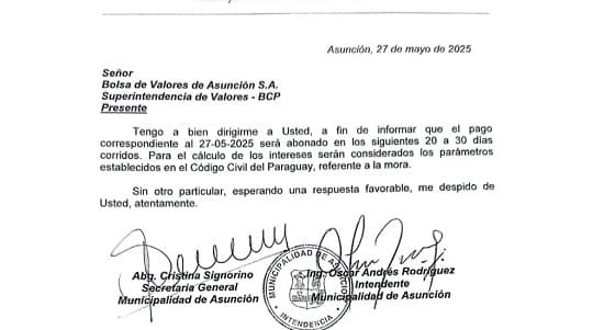 Unite a nuestro canal de FacebookSegún la propia Municipalidad, se ha incumplido el pago de intereses vencidos a fines de mayo, lo que fue comunicado oficialmente a la Bolsa de Valores de Asunción y al Banco Central del Paraguay. Los contribuyentes de la capital deberán enfrentar el pago de G. 857.122 millones solo por intereses, y G. 817.500 millones por capital, sumando un total de más de G. 1,6 billones por bonos emitidos.