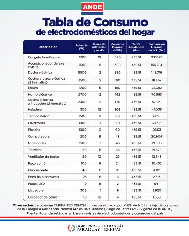 Los datos corresponden a la tarifa residencial de baja tensión de la Categoría Residencial 142, según el Pliego de Tarifas 21 actualmente vigente. La ANDE recomienda a la ciudadanía revisar sus hábitos de uso y preferir artefactos eficientes, como los de etiqueta A, además de mantenerlos en buen estado para evitar gastos innecesarios.