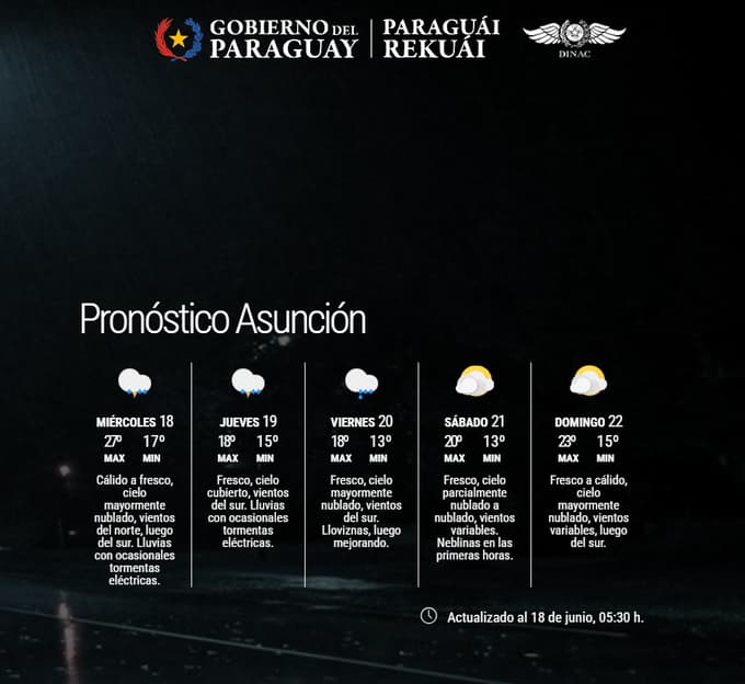 Según el pronóstico emitido por la Dirección de Meteorología, se esperan temperaturas mínimas entre 17 °C y 23 °C durante las primeras horas del día. Por la tarde y noche, los valores térmicos podrían elevarse entre 24 °C y 33 °C, generando una sensación térmica más cálida en el norte y oeste.