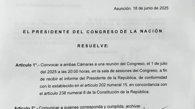 La Constitución Nacional establece que el informe presidencial debe ser presentado ante el Congreso el 1 de julio de cada año, coincidiendo con la apertura del periodo legislativo. En este contexto, la convocatoria oficial al Congreso ya fue emitida: la cita será el lunes 1 de julio, a las 20:00, en la sala bicameral del Poder Legislativo.