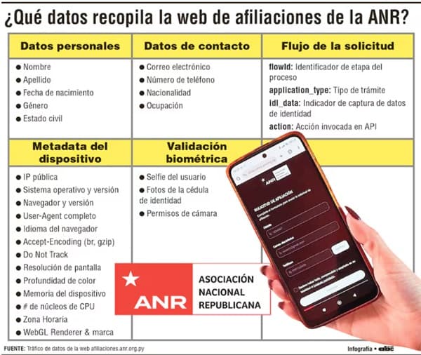 La herramienta digital extrae de forma automática información como nombre completo, fecha de nacimiento y género, y no señala con claridad la fuente de estos datos. Aunque desde la ANR indicaron que el sistema se conecta con el Registro Cívico Permanente, los registros parecen provenir de una base paralela, posiblemente relacionada con la Policía Nacional, que contiene datos actualizados.