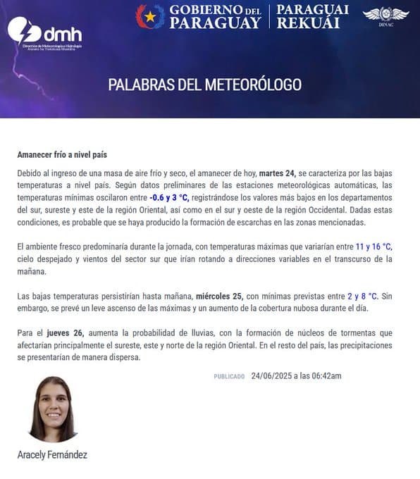 El Día de San Juan comenzó con un ambiente inusualmente frío en gran parte del país, registrándose temperaturas mínimas entre -0,6 °C y 3 °C. El fenómeno afectó especialmente a los departamentos de la región Oriental y el Bajo Chaco, donde incluso se reportaron escarchas en zonas puntuales.