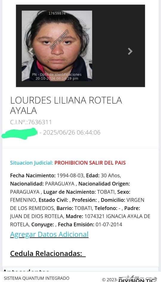 La Policía Nacional detuvo este jueves a la madre y a la hermana de Armando Javier Rotela Ayala, cabecilla del conocido clan Rotela, en un operativo que se desplegó simultáneamente en los departamentos de Cordillera, Paraguarí y Central. Ambas mujeres fueron capturadas en una vivienda familiar en Tobatí.