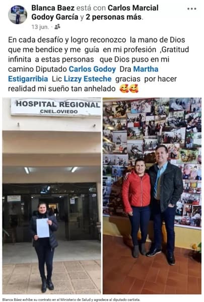 Aida Romero Aquino constituyó otro caso documentado por El Nacional de agradecimientos públicos al diputado cartista por contratos laborales. Su posteo del 13 de junio expresa: “Muchas gracias, diputado Carlos Marcial Godoy García, por cumplir con su palabra y estar presente con nosotros”. Los denunciantes confirmaron que ambos contratos corresponden al Hospital General de Coronel Oviedo.