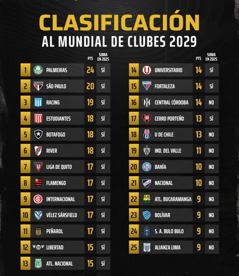 Unite a nuestro canal de FacebookCabe recordar que para el Mundial de Clubes 2025 —que será una edición especial con 32 equipos— la Conmebol tendrá 6 cupos: los campeones de la Libertadores 2021 a 2024 se clasifican directamente, y los puestos restantes se asignan por ránking, considerando el rendimiento acumulado en esas ediciones. Si un club repite campeonato, se habilita una plaza adicional para el mejor ubicado en el ránking.
