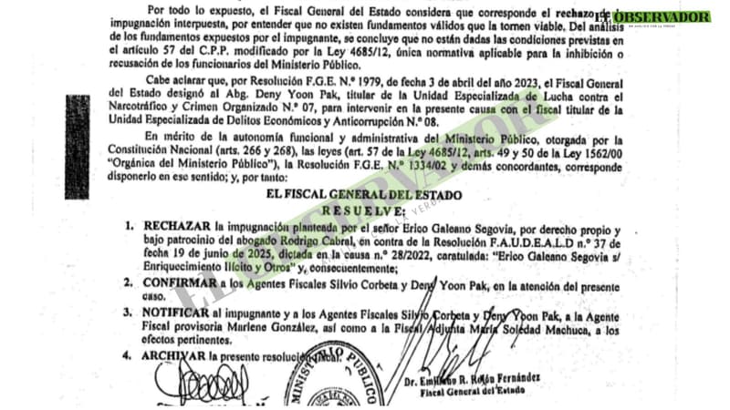 El fiscal general del Estado, Emiliano Rolón Fernández, rechazó la impugnación presentada por el senador cartista Erico Galeano Segovia y confirmó a los fiscales Deny Yoon Pak y Silvio Corbeta Dinamarca al frente del proceso penal que enfrenta el legislador, imputado por presunto lavado de dinero proveniente del narcotráfico y asociación criminal, en el marco del operativo A Ultranza Py.