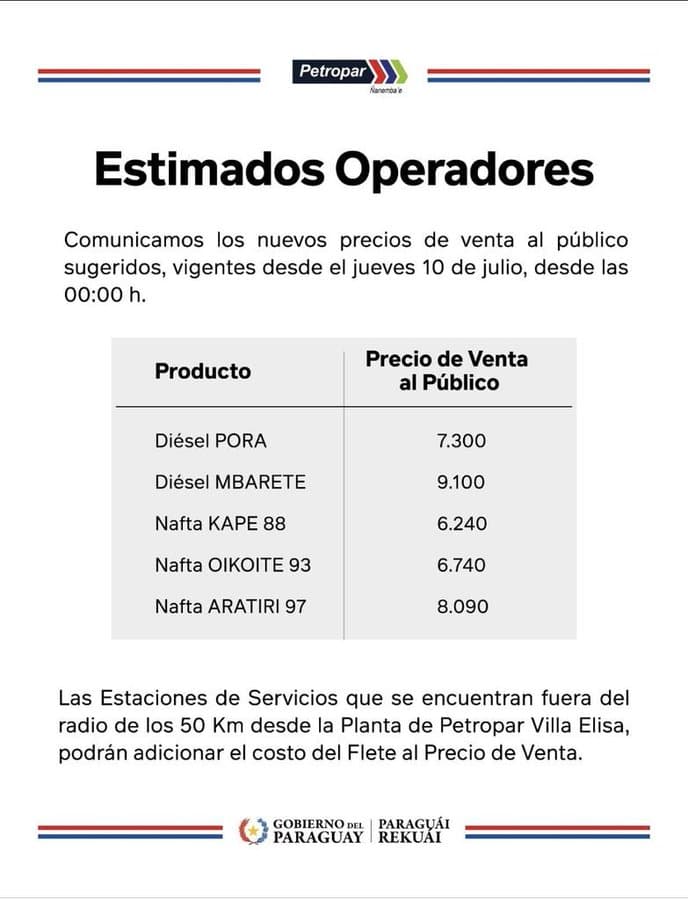 A partir de hoy, la estatal Petropar aplicará un nuevo reajuste en los precios de sus combustibles, con una suba uniforme de G. 380 por litro en todos sus productos. La medida fue comunicada oficialmente a las estaciones de servicio a nivel nacional.