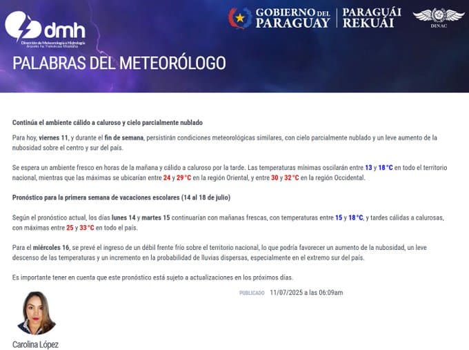 Durante este viernes 11 de julio y hasta el domingo 13, el patrón climático será similar: mañanas frescas con mínimas de entre 13 °C y 18 °C, mientras que por la tarde se registrarán temperaturas máximas que oscilarán entre 24 °C y 29 °C en la región Oriental, y entre 30 °C y 32 °C en la región Occidental.