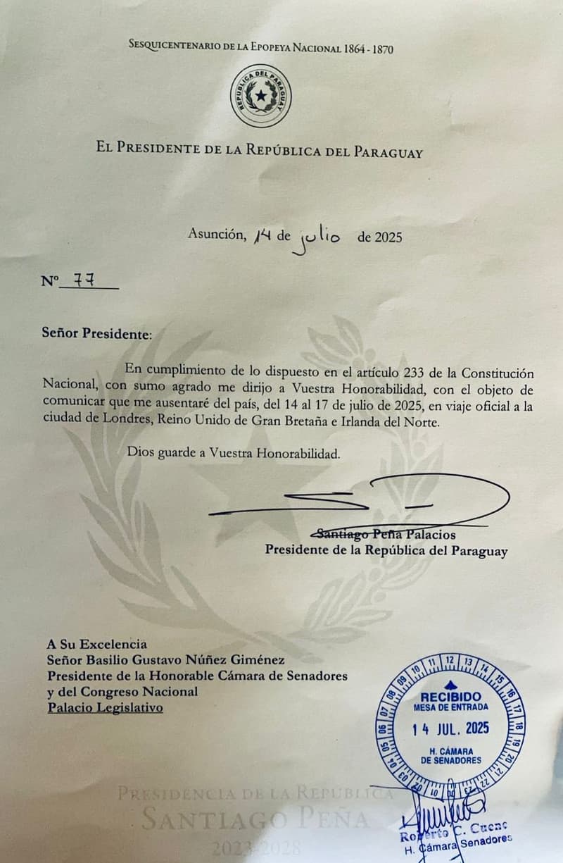 El presidente de la República, Santiago Peña, notificó oficialmente al Congreso Nacional que se ausentará del país desde este lunes hasta el jueves 17 de julio. Durante este periodo, su agenda internacional incluye actividades en Londres, Reino Unido, y posiblemente también en Irlanda del Norte. La información fue remitida al presidente del Congreso, Basilio Núñez, mediante una nota oficial.