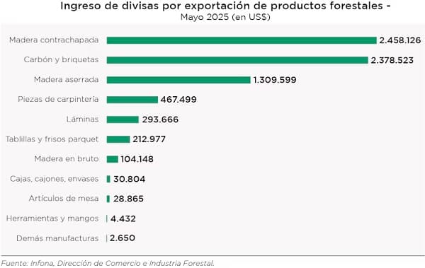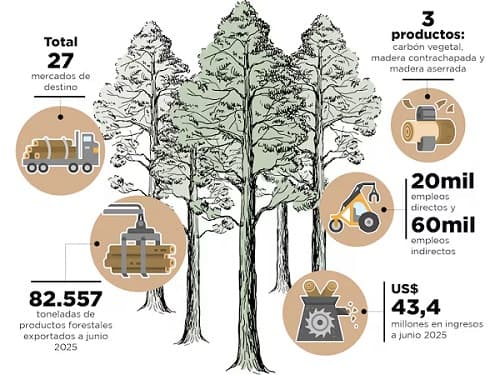 Las exportaciones de productos forestales en 2024 alcanzaron 100 millones de dólares, con 80% correspondiente a carbón vegetal y 20% a madera en diversas presentaciones. El mercado interno continúa siendo el principal consumidor, especialmente en el segmento energético para calderas y secadoras de granos industriales.