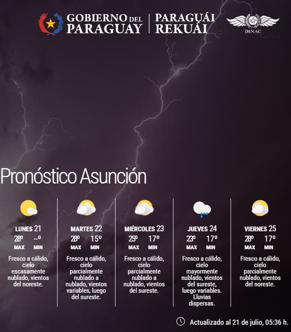 Sin embargo, el alivio térmico durará poco. Según la Dirección de Meteorología e Hidrología, las temperaturas irán aumentando con el correr del día, alcanzando máximas de entre 26 °C y 28 °C en la mayoría de los departamentos de la Región Oriental. En sectores más expuestos al calor, como el noreste y el centro-norte del Chaco, las máximas podrían superar los 30 °C.