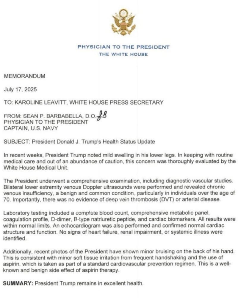 Karoline Leavitt, secretaria de prensa, aclaró que si bien se detectó la IVC, los médicos no hallaron signos de trombosis venosa profunda ni enfermedad arterial. “Los estudios fueron preventivos ante los signos externos, pero no hay compromiso agudo de la salud del presidente”, detalló.