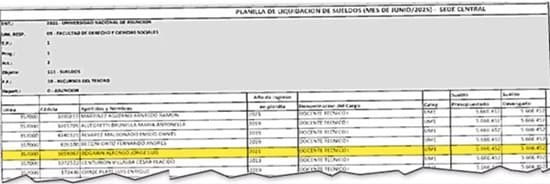 Según datos del Ministerio de Economía y Finanzas, Bogarín percibió salarios como profesor asistente hasta mayo de 2025 en la Facultad de Derecho, cuando presentó su renuncia formal a dos cátedras. No obstante, mantiene vigente el cargo de “docente técnico I” desde julio de 2021, con un salario mensual superior a los G. 5.600.000, además de figurar como docente activo en la Facultad de Ciencias Económicas desde 2024.