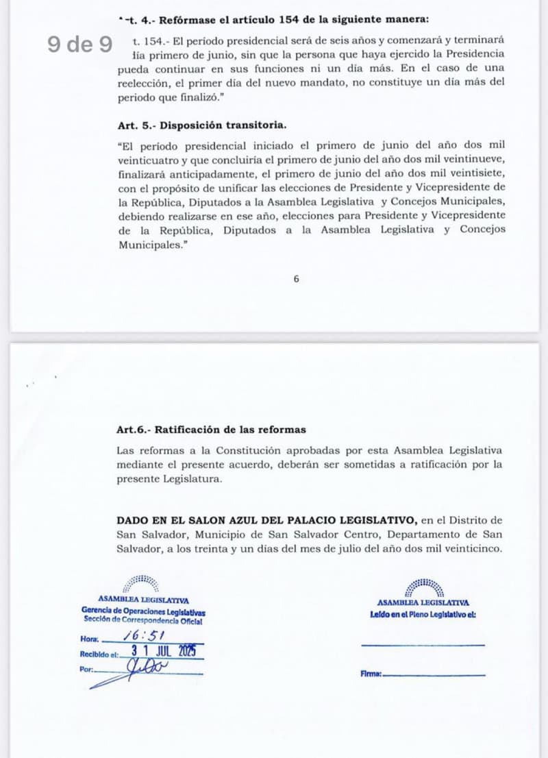 La nueva ley también establece que el actual periodo presidencial, iniciado en 2024, culminará anticipadamente en 2027. En ese año, se celebrarán elecciones presidenciales, legislativas y municipales de manera concurrente. Bukele, por ahora, no se ha pronunciado sobre el cambio, aunque su popularidad y control del Congreso facilitaron la maniobra legal.