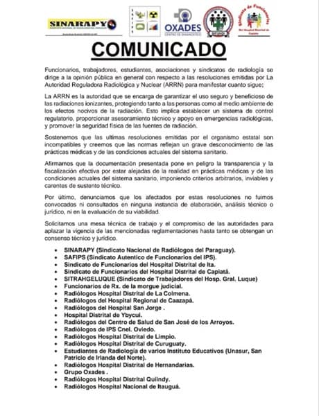 El gremio de radiólogos de Paraguay manifestó su rechazo a las nuevas disposiciones establecidas por la Autoridad Reguladora Radiológica y Nuclear (ARRN), que impone requisitos adicionales para ejercer la profesión y prevé sanciones económicas consideradas excesivas.