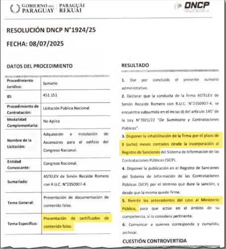 Según la Resolución DNCP N.º 1924/25, emitida el 8 de julio pasado, Astelev, representada por Simón Recalde Romero, incurrió en una “falta grave” al entregar documentación apócrifa para justificar su experiencia técnica. En consecuencia, la empresa fue inhabilitada por ocho meses en el sistema de contrataciones del Estado.