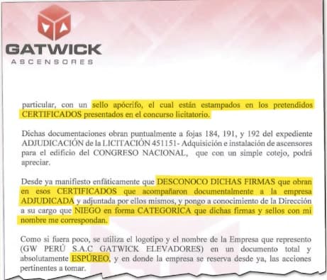 Los documentos fraudulentos habrían sido emitidos por la empresa peruana GW Perú SAC Gatwick Ascensores. No obstante, su representante legal, Luis Nores, denunció que dichos certificados nunca fueron expedidos y que los sellos y firmas utilizados eran falsos. La documentación en cuestión abarcaba certificados de años anteriores que respaldaban presuntas capacitaciones y servicios técnicos.