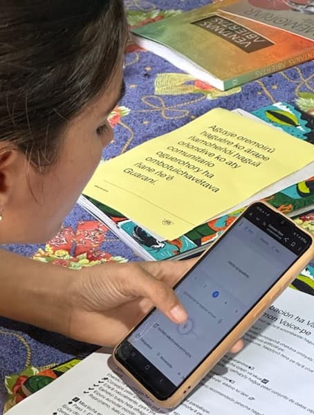Populación de audio en Guarani con la interfaz de Common Voice durante un aminga en Arroyito, a 320 kilómetros de Asunción, Paraguay.Titulares