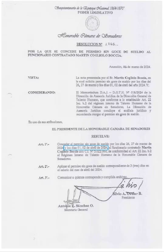 El presidente del Congreso Nacional, Basilio “Bachi” Núñez (ANR-HC), anunció este miércoles la apertura de un sumario administrativo con suspensión de salario al funcionario Martín Cogliolo Boccia, sobrino de la senadora liberal Celeste Amarilla y colaborador directo del senador Éver Villalba.