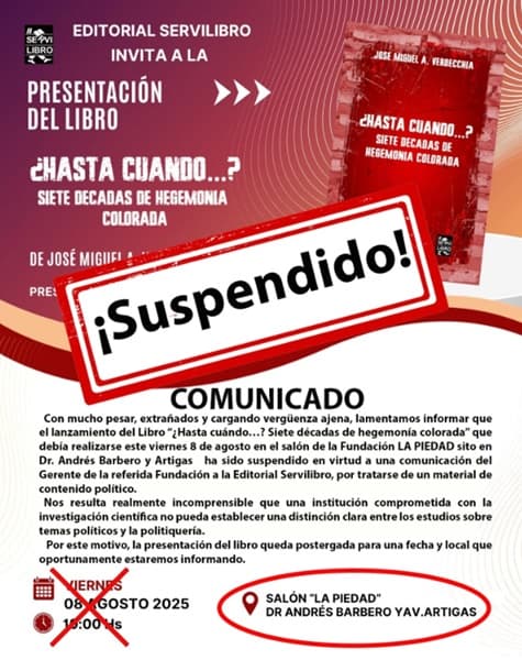 La Fundación La Piedad decidió suspender el lanzamiento del libro titulado “¿Hasta cuándo...? Siete décadas de hegemonía colorada”, obra del abogado y sociólogo José Miguel Ángel Verdecchia. El evento estaba previsto para este viernes 8 de agosto en el local de la institución.