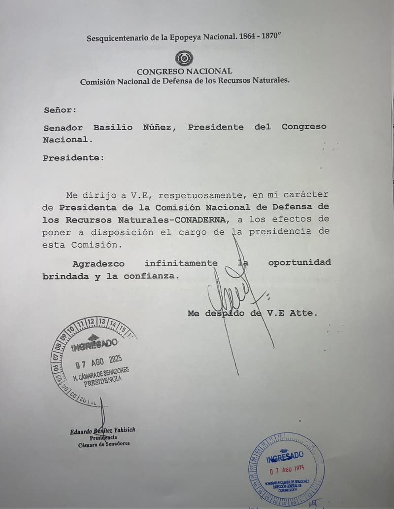 Mediante una nota escueta y sin aclaración de cargo, Cabrera comunicó al presidente del Congreso, Basilio “Bachi” Núñez, su decisión de apartarse de la presidencia de Conaderna, comisión que administra un presupuesto superior a G. 4.800 millones. Además, cuenta con una camioneta Chevrolet Silverado cedida por la Senabico, la cual era utilizada por la senadora para fines particulares.