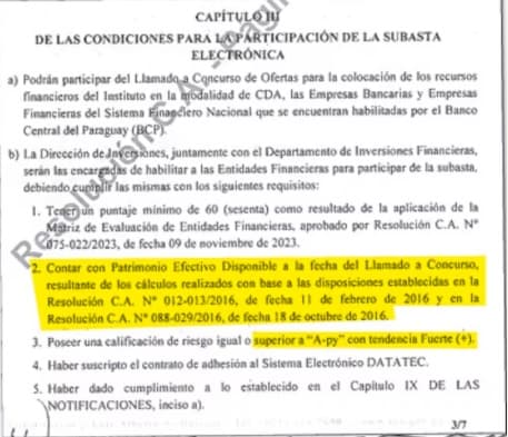 Antes del cambio, las resoluciones de 2016 establecían que las propuestas de inversión no podían superar el límite del patrimonio neto efectivo de cada entidad, determinado mensualmente con datos reportados al Banco Central del Paraguay. Además, se fijaban porcentajes máximos: hasta el 100% del patrimonio para bancos y el 45% para financieras.