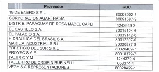 También figuran El Castillo SA, cuestionada proveedora de alimentos; Distribuidora Paraguay, asociada a casos de alimentación escolar; y Vega SA, con antecedentes por la mala calidad de la merienda escolar.